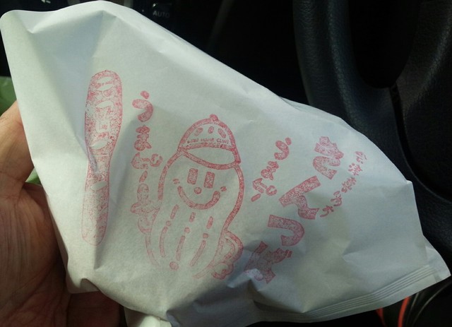ピーナッツきんつばは一個150円、きんつばとは言いますがつまりは大判焼きです。中にはとろ~りとしたピーナッツクリームが入っています。生地の風味はそこそこ、とびきり美味いと言う程ではないですが、美味しいです。中のピーナッツクリームの甘さを引き立たせるために、生地の甘さは控え目になっています。運転のお供に美味しくいただきました。