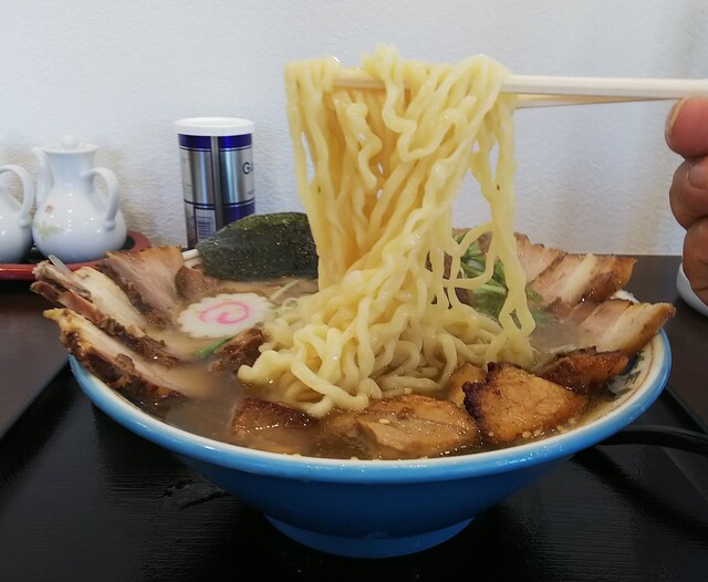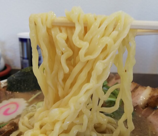 麺は赤湯系の平打ち縮れのピロピロ麺、モチモチした弾力もあり、食べ応えも良いです。風味が立っているので小麦の風味が余韻となって残る美味しい麺です。