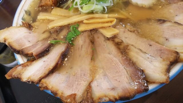 トッピングは何と言ってもこの丼面を覆い尽くす圧倒的なチャーシューの量の凄さです。しかも量だけでなく味わいも最高で、食感もとろけるなかなかの美味さです。チャーシューはでかい平で10枚、更に角切りのコロチャーシューもゴロゴロ転がっています。このコロチャーシューもトロトロにやわやわです。水菜や刻みネギもありますが、この怒涛の肉々攻撃に対抗するにはベジ系は少なすぎます。