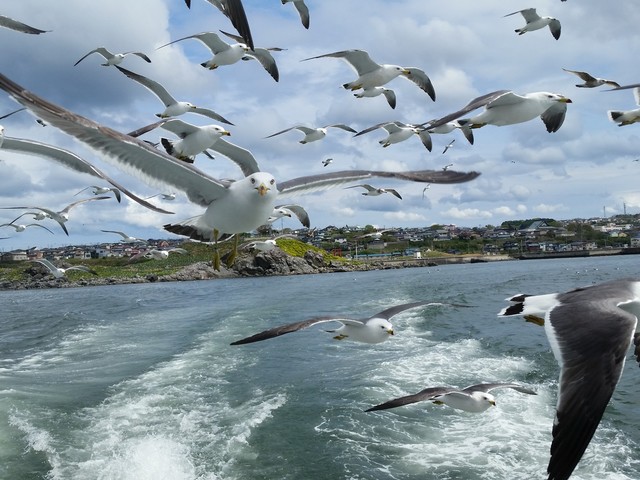 ひたすら船を追ってくるウミネコの群れに「かっぱえびせん」を