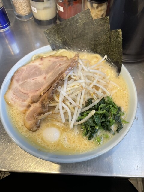 豚骨醤油、味濃いめ、太麺、やわらかめ、もやし、麺増しと注文。