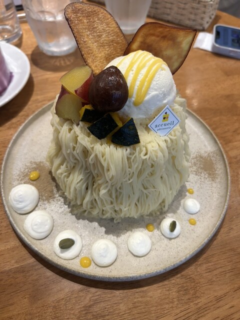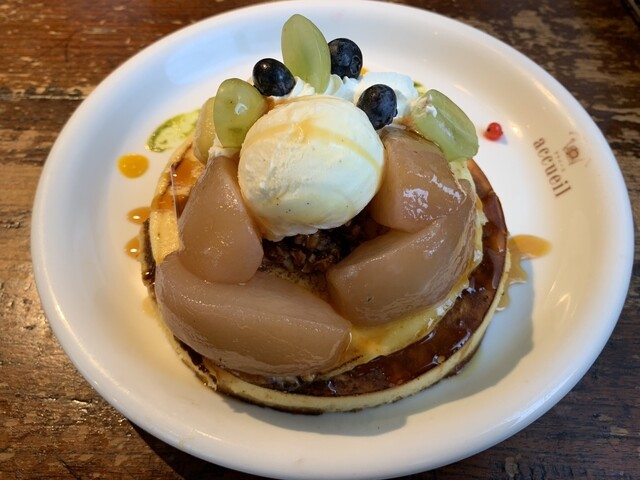 → アクイーユのぱんけーきに、洋梨ペーストのクリームが塗られ、その上にシャキッとした洋梨とコンポートがのっていました。