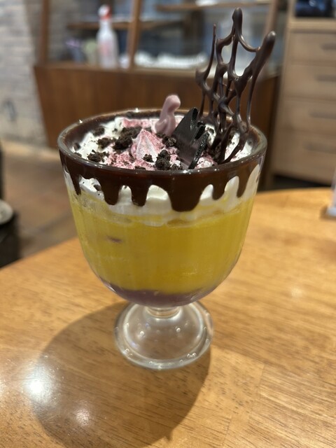 パンケーキは「ハロウィンパンケーキ 〜甦るカボチャのジャック〜」2,310内。意外にも初の、フィルム引き上げると具材がバラバラ落ちて画になるメニューだったようです。いつものハロウィンパンケーキとは様相が違いました。紫芋ソースとシャーベットの味のアクセントが良かったです。