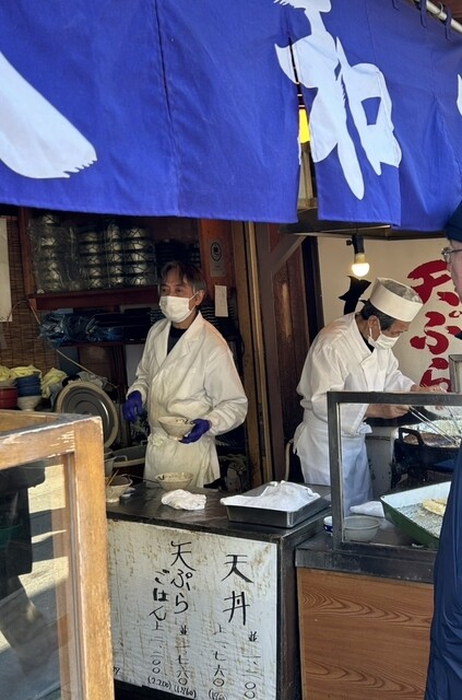 店頭で天ぷらを揚げるスタイル。『天つゆが足りない場合は追加しま〜す』と言う店員さんのサービスも◎
