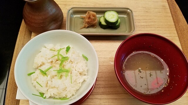 新生姜ご飯・とろろ・玉ねぎのすり流しの止椀。香物