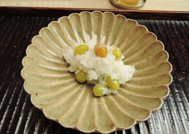 最後のデザートは「くるみ餅」です。きなこの風味がとてもよかったのですが、黒豆のきなこと普通のきなこを混ぜ合わせているので