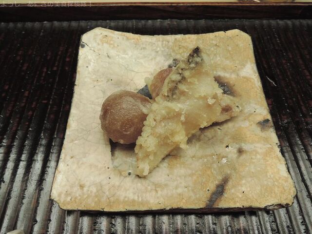 椀ものは、鱧餅です。焼目の香ばしい餅に包まれた鱧を頂きました。出汁がとても上品かつうまみたっぷりです。