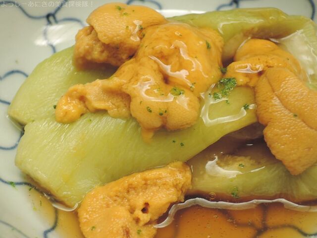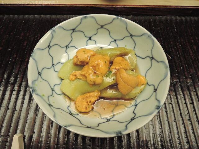 炊き合わせは長茄子と天草の雲丹です。九州の雲丹はわかめを食べているので とても濃厚でかつ雑味が一切ありませんでした。