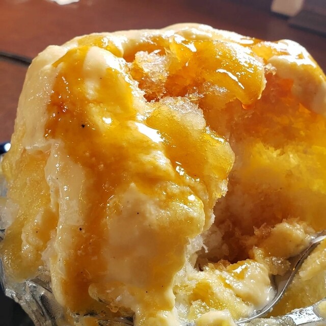 アップルは爽やかなバニラやカスタードソース。オレンジはチョコレート系の濃厚な味わい。果肉やソースがたっぷりなために溶けた氷も水っぽくなく美味しく食べられました。