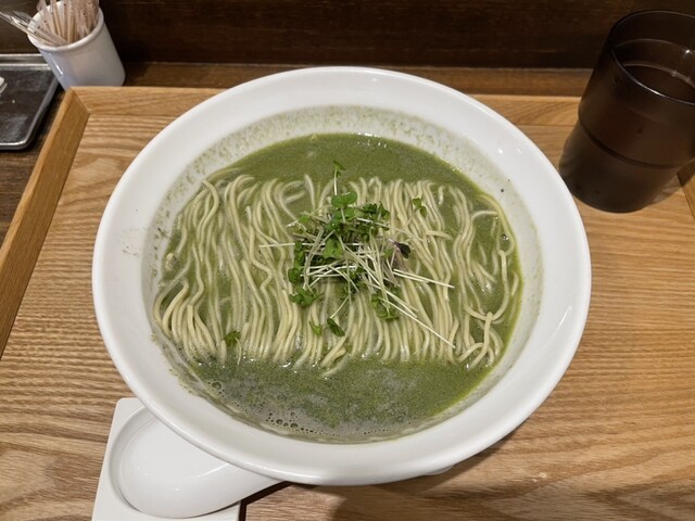 席について程なく着丼。濃い深い緑色のスープ。特濃浅利は普通のニラ煮干より、スープのトロみが強く、浅利の風味もプラスされ、普通のニラ煮干よりいいですね。