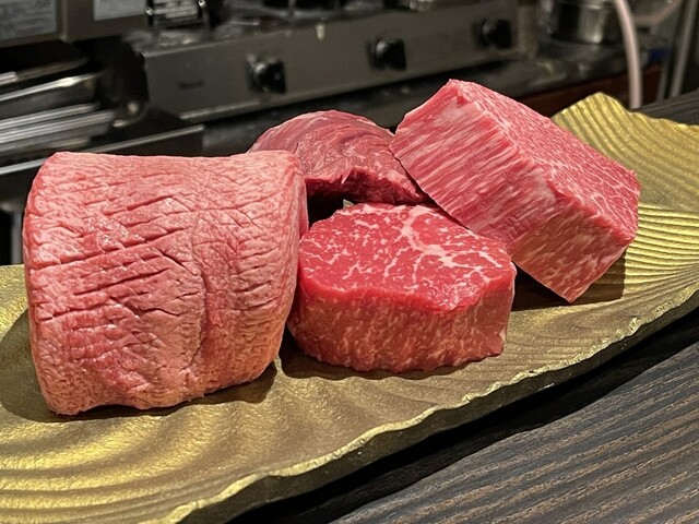 今日のお肉4種(フィレ、サーロイン、タン、クリ)のプレゼンテーション(他にもほほ肉などが出てきます)