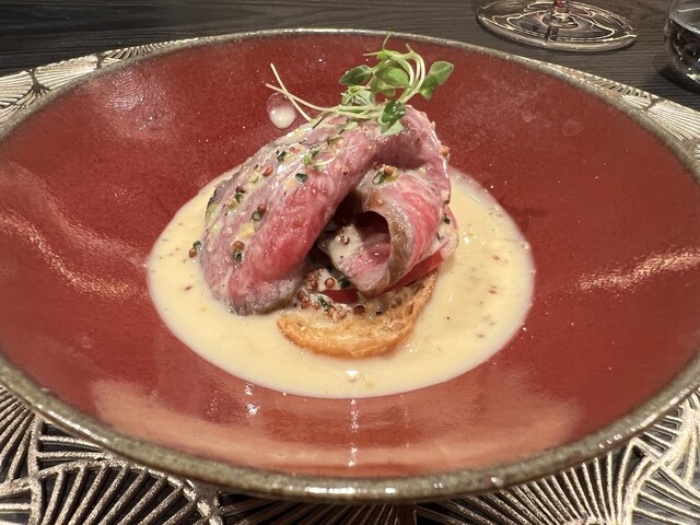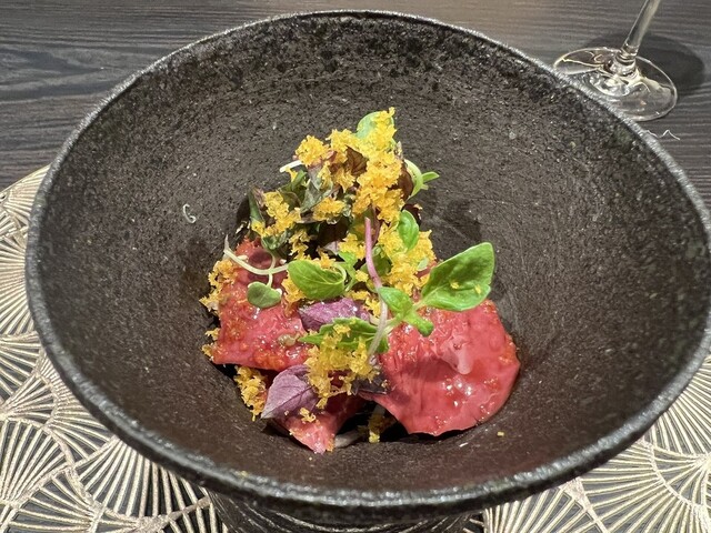 和牛、山芋、パッションフルーツ その上に雲丹とキャビア