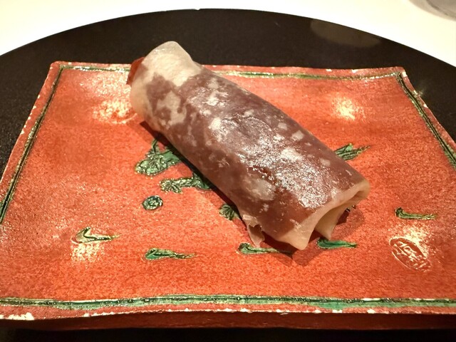 金目鯛(千葉)の上に長崎の紫雲丹 くらげの甘酢漬け