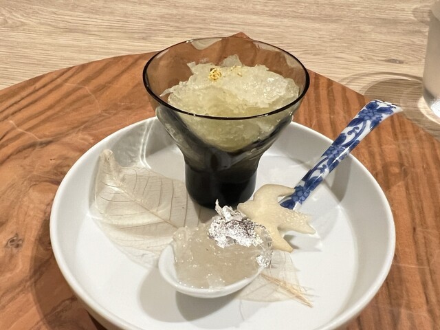 酸梅湯(さんめいたん)という梅のドリンクのソースをかけた 栗のアイス リコッタチーズ 栗の角切り
