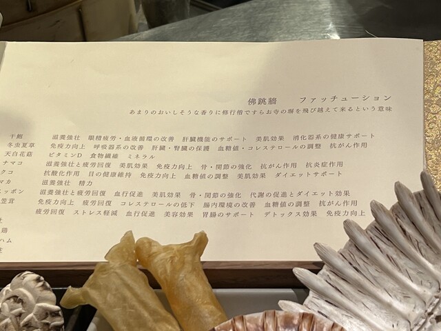 約25年前に北新地の「ミヤザワ」で食べたので知っていました。中華料理の海鮮スープで仏様も美味しくて塀を飛び越えたという意味と聞きました。宮沢さんが我々のためにわざわざ香港まで行って材料を仕入れてきてくれたので、この1品だけ(6人前)で20万円でした。タツノオトシゴが姿を崩さず入っていたのを覚えています