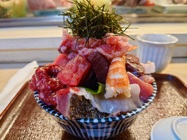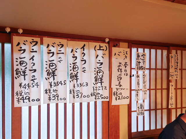 海鮮丼好きとしてこちらの店は外せないですね。この日は丸ノ内線・本郷三丁目駅から歩きました。多少アップダウンを歩き、10分程度でお店に到着。お店のオープンは土曜日ですので12時。到着は11:45に到着。前に5名が並んでいました。蒸し暑い中、12時に向けて人がどんどん増えていきます。そしてオープンの12時。数えると16名が並んでいました。オープンして一人ずつ人数を聞かれて1名はカウンター、2名はテーブルへ案内されました。私はカウンターで大将の正面。ベースの(上)バラ海鮮を準備しています。そして注文を順番に確認されます。私は「ウニのせ」と悩みましたが、価格差が+1,400円にビビってしまい、通常の(上)バラ海鮮(2,500円)と魚汁(350円)を注文。待ってる間に店内を見回すと、夜はおまかせで1万円。他はドリンクなど、夜も気になりますね。そして、店内の席で5名程度が待ちます。暑いのでこれは助かりますね。店内の観察をしていると運ばれてきました(上)バラ海鮮。凄いです、山盛りです。店名の富士はココから取ったのかと思うくらい山盛り。そして美味しそうなネタです。一番上のネギトロから食べ始めます。刻み海苔と混ぜて醤油を垂らして・・・美味しい! すると、メニューの説明が、「真っ赤なネタはクジラです、生姜でお召し上がりください」との事。早速生姜で食べると新鮮ですね、とても美味しい。鰹、えび、ホタテ、たこ・・・途中でネタ確認を諦め、食べすすみました。やっとご飯が出てきてココでわさび醤油を垂らします。そして、ご飯の上には海苔・・・と、思ったら、なんとワカメ。しっかりご飯の上にひいてあり、コレも美味しい~ ご飯までたどり着いたタイミングで魚汁が運ばれてきました。ネギたっぷり、一味が軽く振られています。魚の出汁がたっぷり出た魚汁、大根がしっかりそれを吸ってこちらも良いです。うっすら柚子の香りも。素晴らしいです。是非、セットで注文をオススメします。20分程度で食べ終わり12時半にお店を出ました。外には2名が並んでいて、思ったよりも並びが少ない土曜日でした。次回は「ウニのせ」をチャレンジします! ごちそうさまでした。