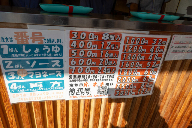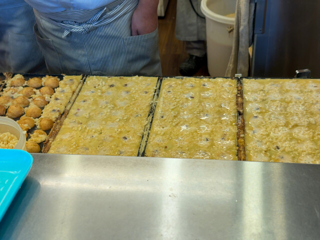 事前調査で並んでいるのはわかっていましたが・・・お店の横の道路まで並んでいました。並んでいる人数はそうでも無いのですが、一人当たりの購入数が多いのかなかなか進みません。前に10名程度でしたが、恐らく30分は並んだかと。注文は12個4番(ソースとマヨネーズの両方)400円を注文。お店の中でも食べられるようです。焼き上がると数を数えて舟にのせて後ろのソース係へ。そこでソースとマヨネーズと生姜が添えられてテイクアウト用に袋に入れてくれます。お店を出て、10分程度で食べましたが、まだまだ熱々、トロトロ。小ぶりなので30個は食べられたかも(笑) 中はトロトロですが歯ごたえのあるタコにコンニャクが入っています。醤油ベースの生地ですので出来たてそのままを次は食べてみたいです。次回も並んで食べます!!