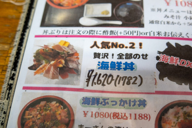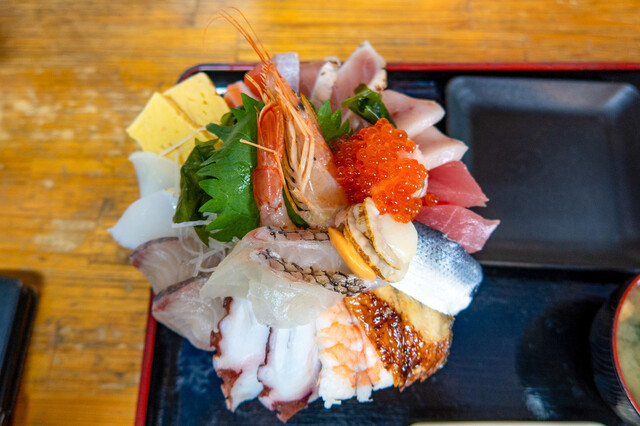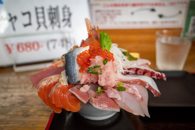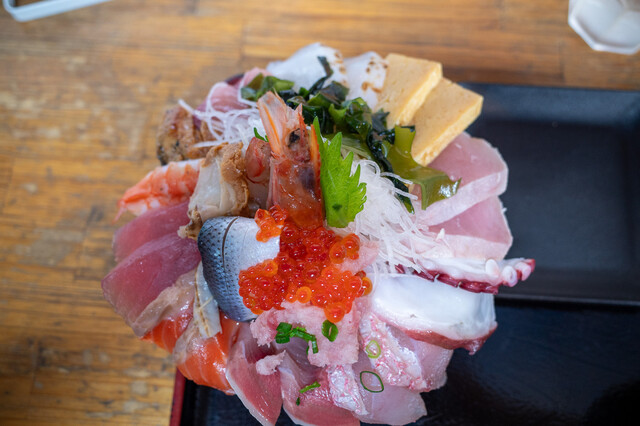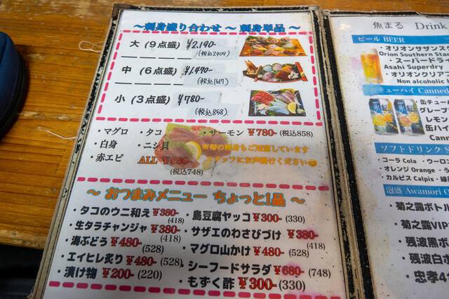 沖縄・那覇空港からゆいレールで一駅。赤嶺にある「魚まる」。海鮮丼マニアとして、やはり沖縄の海鮮丼も食べたく赤嶺駅からレンタル自転車で向かいました。お店に到着すると並んでます。私はお一人様+自転車と言う事で駐車場も並ばず、更にお一人様用のカウンターは空いていてすぐに案内されました。海鮮丼と決めていたのですが・・・色々メニューがあり悩みます。いやいや、通常の海鮮丼を食べるために来たので、海鮮丼(1,782円)にオプションの酢飯(55円)で注文。10分程度で運ばれてきました。凄い(笑) 完全にはみ出てます。そして、取り皿がついていますね、そのままでは食べられない丼です。頂上にエビ、そしてイクラが。かなり豪華ですね。そして酢飯はさっぱり酢飯で美味しいです。是非、オプションでは無く通常が酢飯で良いのではと思います。取り皿にネタを移して食べますがどのネタも新鮮で美味しいです。そしてもずく酢もついて楽しいですね。かなりレベルの高い海鮮丼でした。なお、ゆいレールは1駅だけの利用はOKICAで乗車すると150円です。初期投資で1000円かかりますがお得ですよ。
