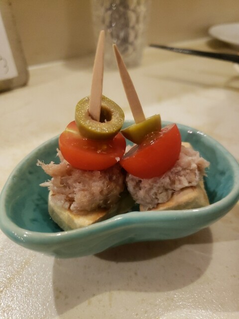 豚リエット、オリーブ、ミニトマト、お麩のピンチョス。ネーミングセンス良し!食感よし!