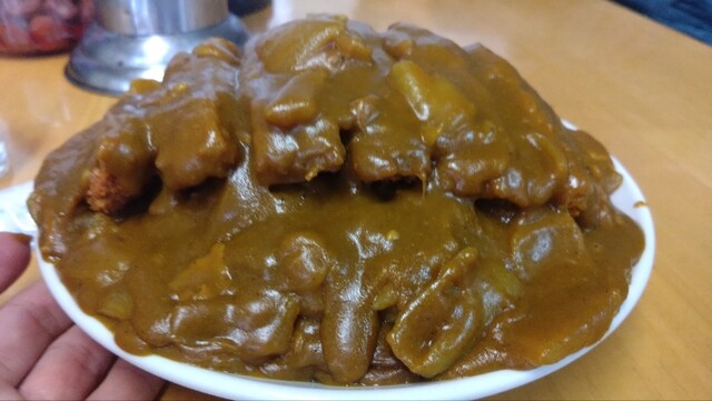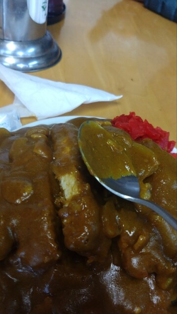 ◎ カレーソース固めでドロっとしたタイプ。甘く感じる感じるが、1/4を口にしたら背中に汗が滲んでました。丁寧なソース作りです。厨房の窓からお母さんが小鍋をかき混ぜてる動きが見えました。