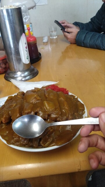 11:03入場で3番手。1名はカウンター席でカレーらしきものを既にかきこみ中、モリモリした肉炒め、次に私のカツカレー、最後に半オムライス。。。