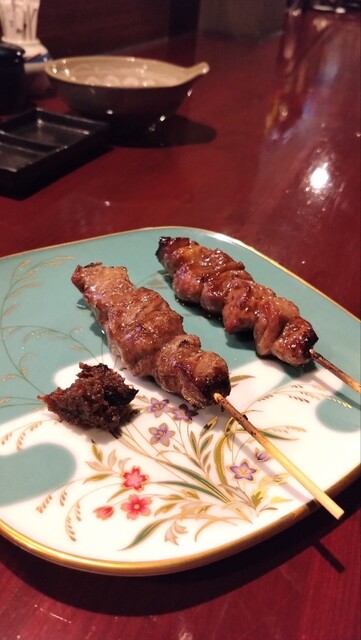 こちらもお洒落な皿に小粒気味のかしら肉が計12ケ。2本の串に品よく。値が張るのは塩とタレの両方だから。付け合せに「にんにく味噌」が付いてました。