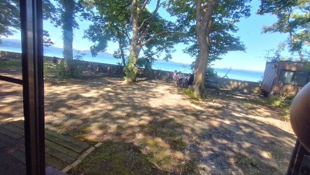 軽く汗が滲む9:45頃、店の周囲に広がる木陰で涼んでいると、車が2台侵入し、スムーズに全員が野外テーブルへ。
