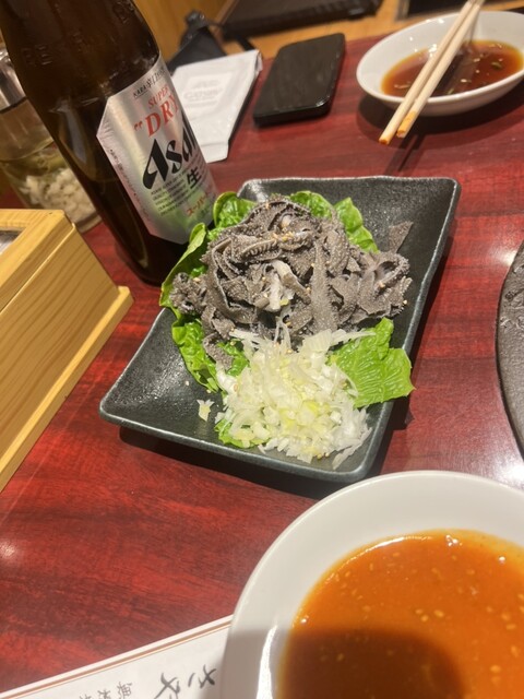 →味付けかと思いきや塩、タレ、塩胡椒を選ぶタイプ。ホルモン5種が綺麗に盛ってあります。おすすめのタンスジもこのセットでいただけます。