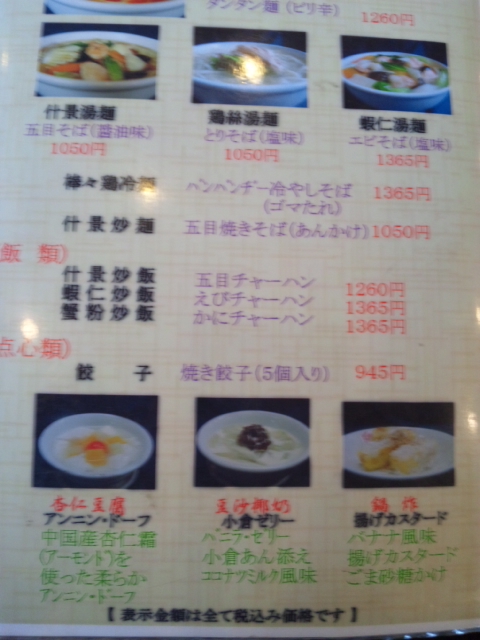 麺類では、五目そば、とりそば(塩味)、海老そば(塩味)、棒棒鶏冷やしそば、五目焼きそば。飯類では、五目炒飯など。