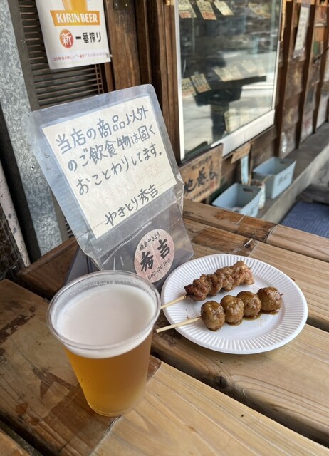 北鎌倉から建長寺、鶴岡八幡宮を巡って、鎌倉までウォーキングしました。ちょい飲みビールと、つくね2本、ぼんじりをいただきました。まだ早い時間だったからか、やきとりの種類は少なかったです。お店の横の1人がけテーブルを利用しました。ごちそうさまでした。