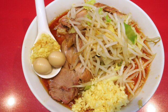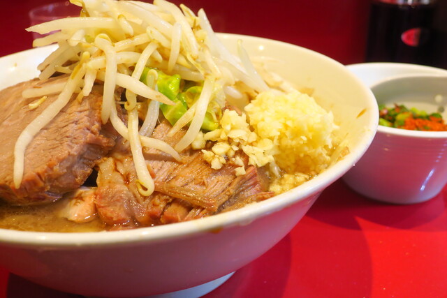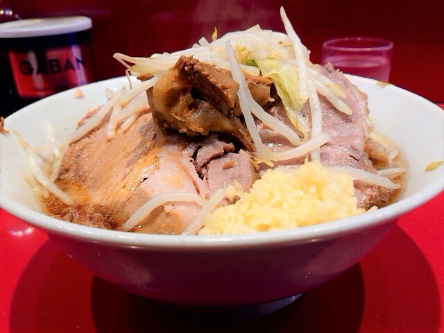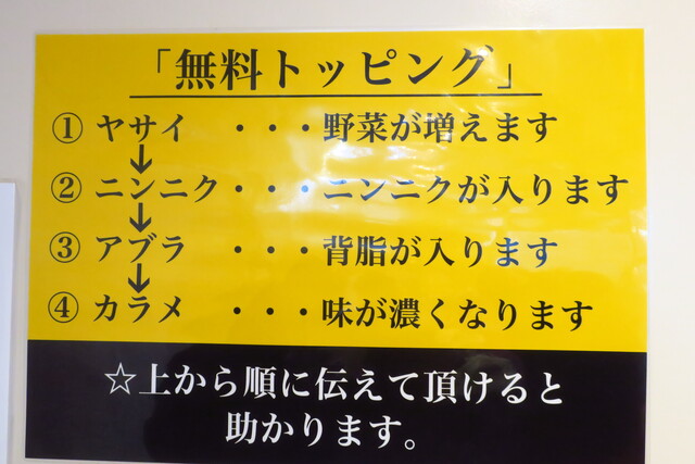 無料トッピングは、ヤサイ、ニンニク、アブラ、カラメ