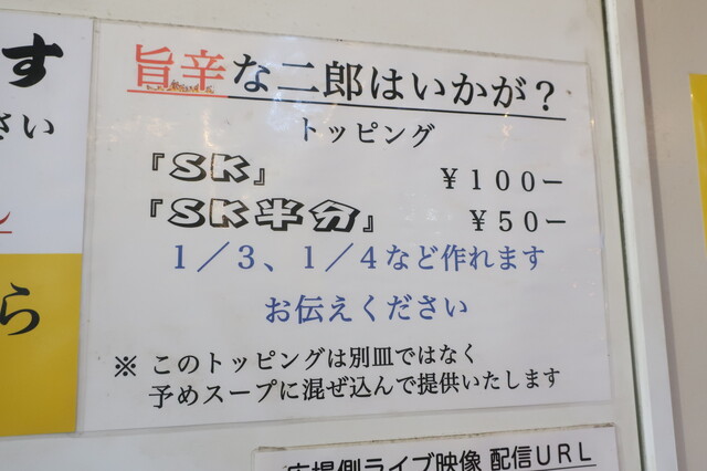 基本メニューは、ラーメン、SK(半分・1/4も可)、汁なし