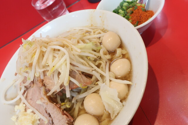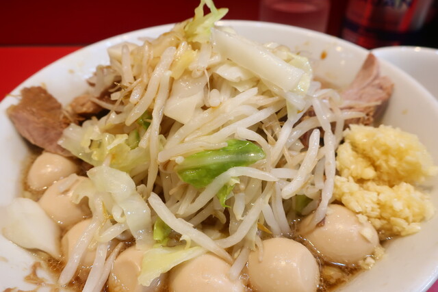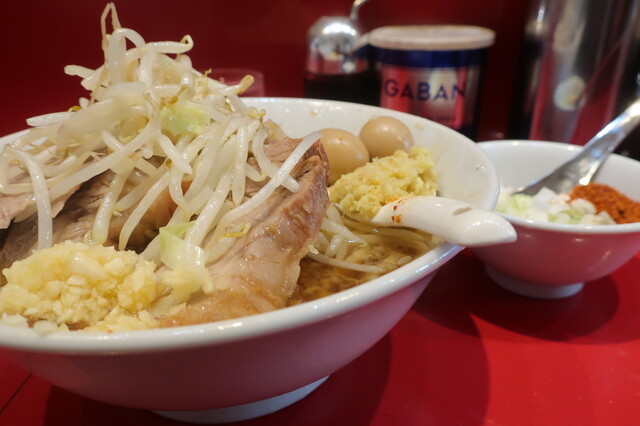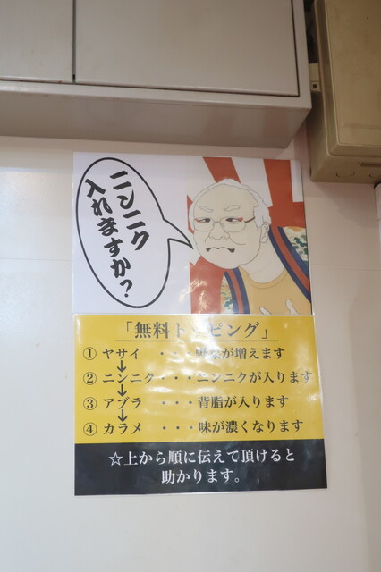 無料トッピングは、ヤサイ、ニンニク、アブラ、カラメ