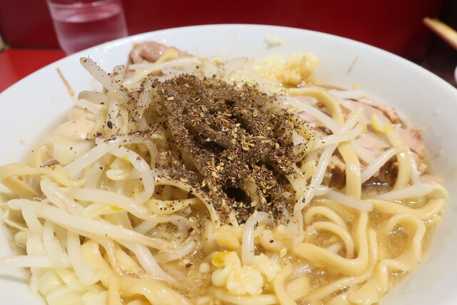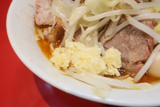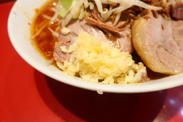 ラーメン半分+ニンニク多め+白ネギショウガ半分