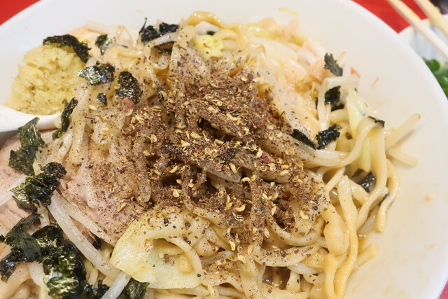 汁なし半分+アブラ少し+青ネギショウガ半分