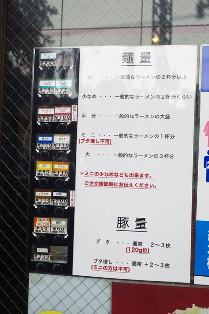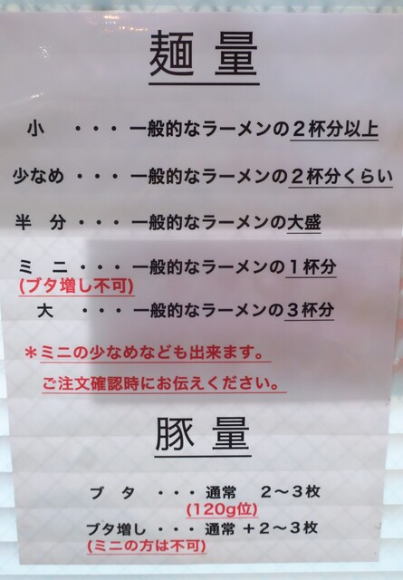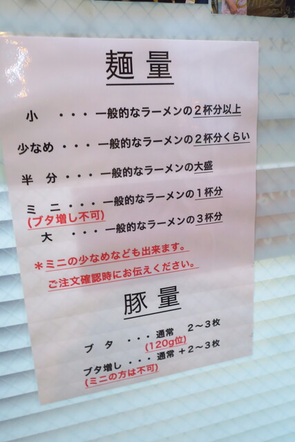 麺量は、一般的なラーメン比で小は2杯以上、少なめは2杯、半分は大盛、ミニで1杯、大は3杯