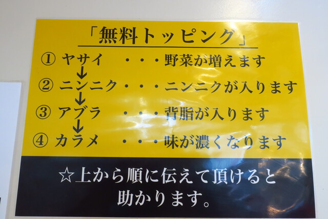 無料トッピングは、ヤサイ、ニンニク、アブラ、カラメ