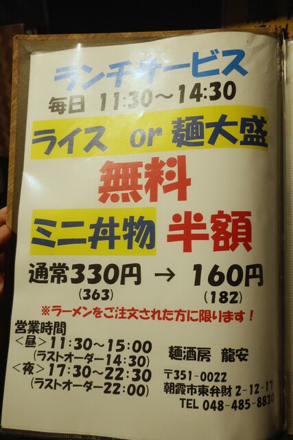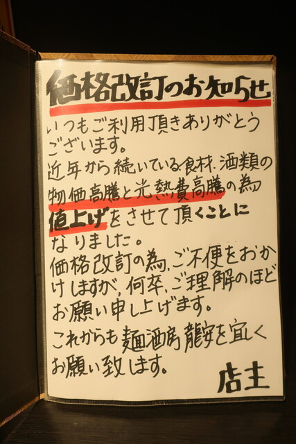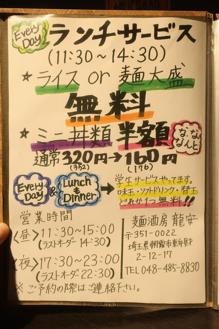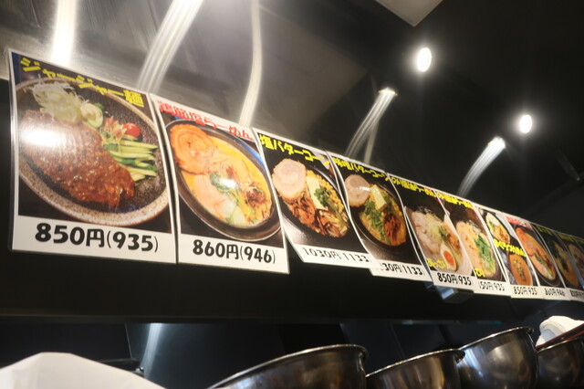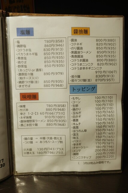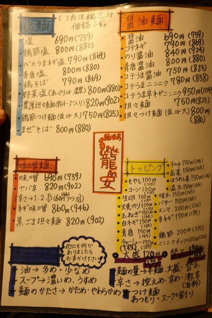 基本メニューは、らーめん(醤油、塩、味噌)、担々麺(濃厚、辛味噌)