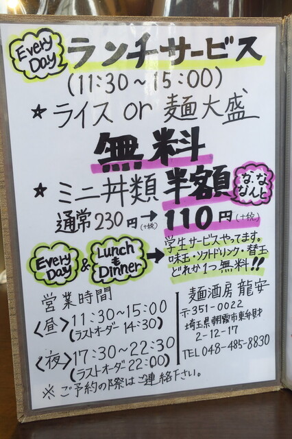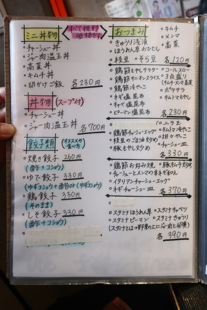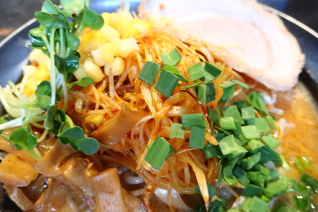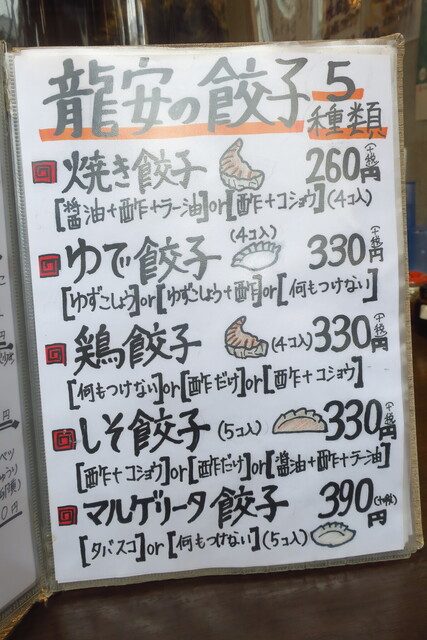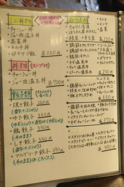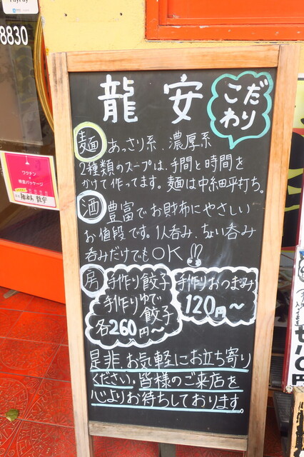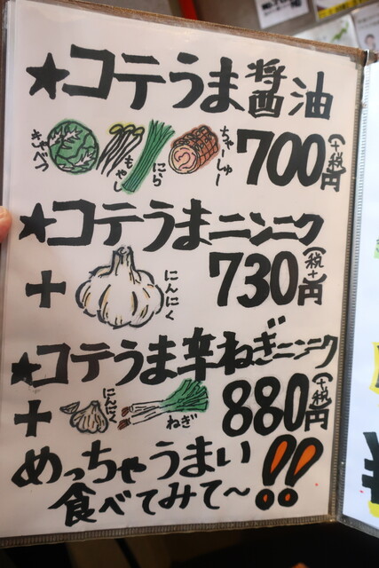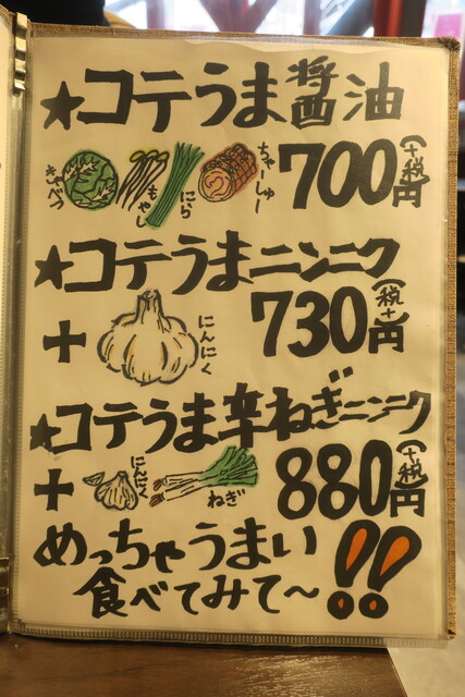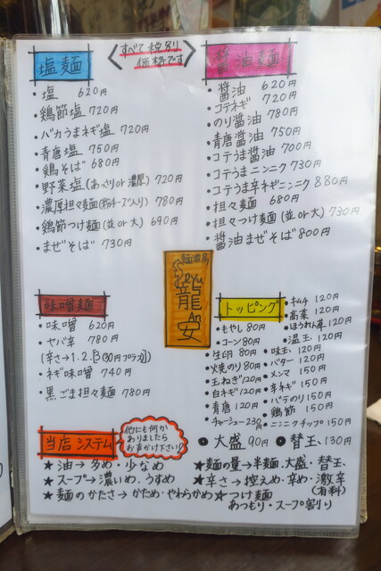 基本メニューは、らーめん(醤油、塩、味噌)、担々麺(濃厚、辛味噌)