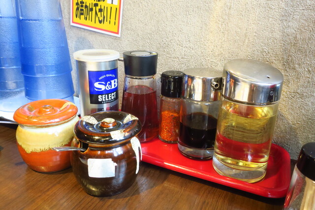 七味、こしょう、ねぎ油、酢、醤油、刻み紅生姜