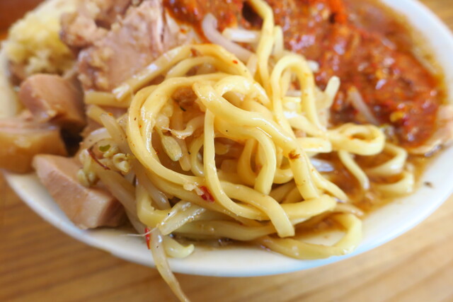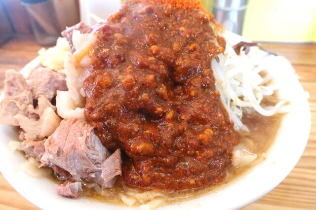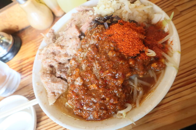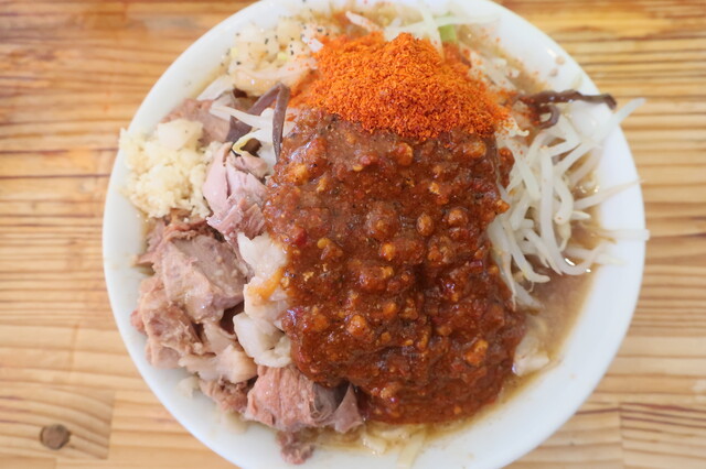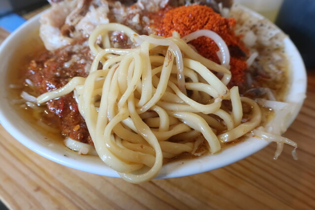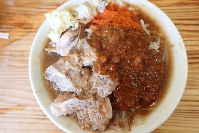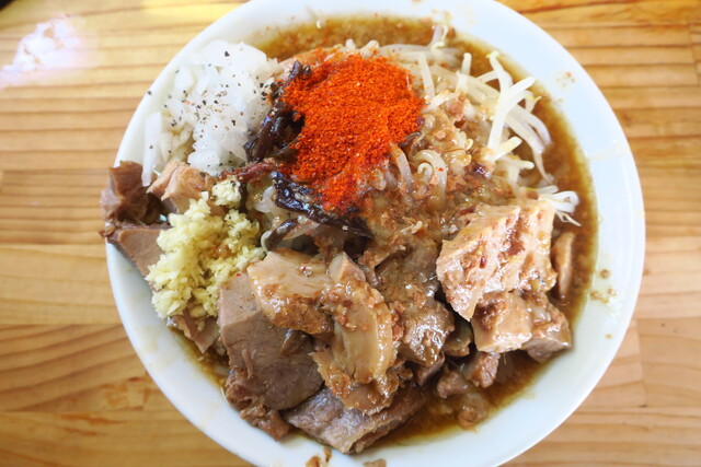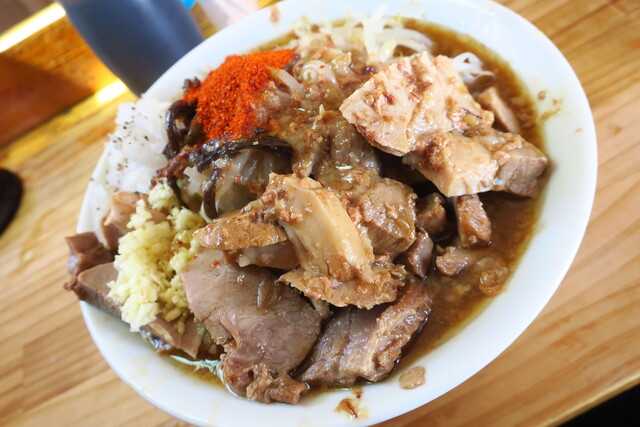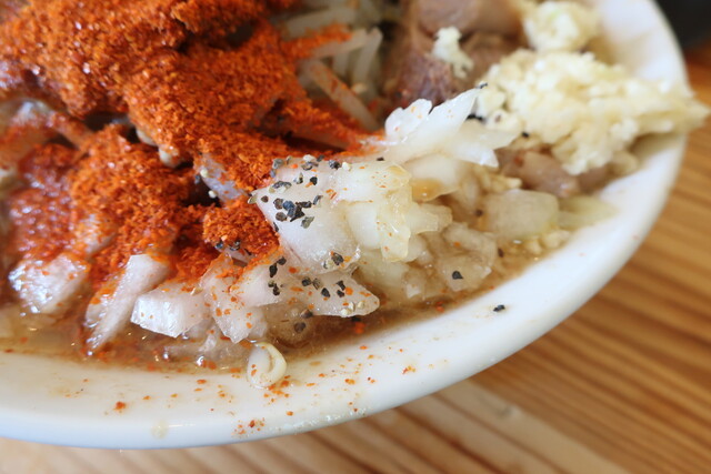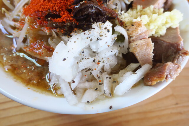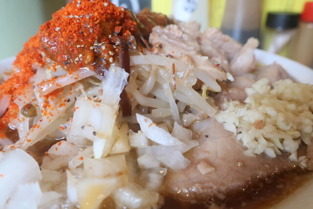 無料トッピングは、ヤサイ、にんにく、アブラ、カラメ、ヤクミ(玉ねぎ)、とうがらし
