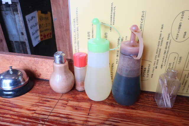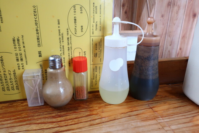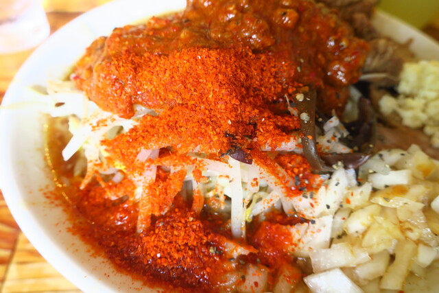 無料トッピングは、とうがらし、ヤクミ(玉ねぎ)、ヤサイ、にんにく、アブラ、カラメ