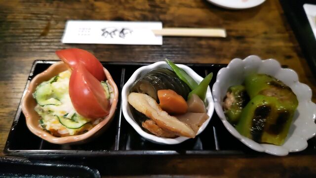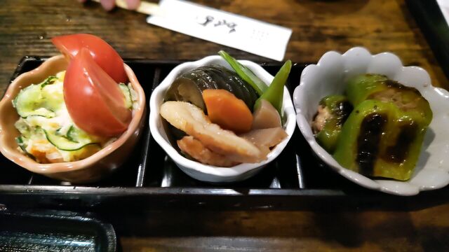 お晩菜三種盛り。ポテト、肉詰めピーマン、野菜の煮物。これまた上手。