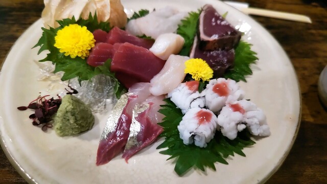 まずはお造り盛り合わせ。鱧おとし、カツオのタタキ、マグロ天身、シマアジ、イカなどなど。ホオヅキまである。