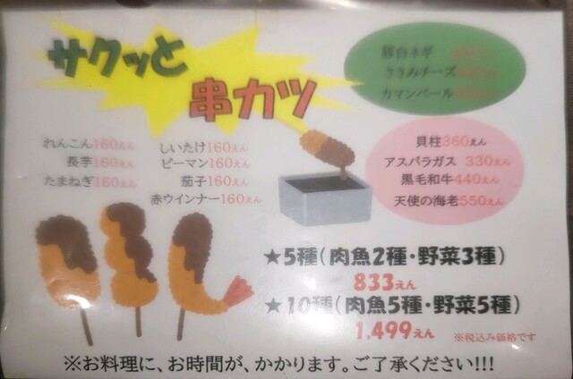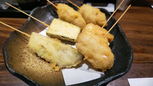 串カツは豚白ネギ260円×2本と、ささみチーズ260円×2本など。これもやや高めだが、美味しい。