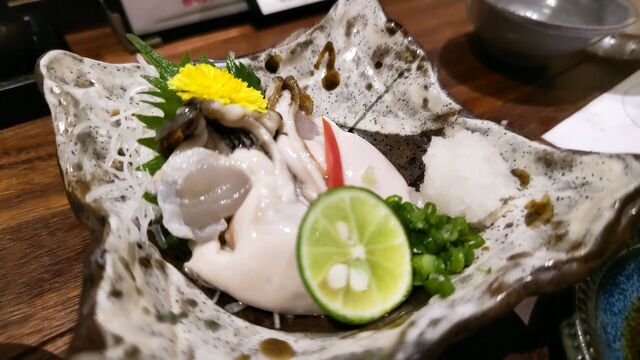 北海道仙鳳趾の生牡蠣ポン酢888円と、お造り3種盛り(生タコ、金目鯛、穴子)1180円。やや高い設定だが、しかしそれ以上に美味しい。満足する味。牡蠣は大きくてとてもクリーミー。お造りも、金目鯛など珍しい。お造りで食べるのは初めてかも。感動する。