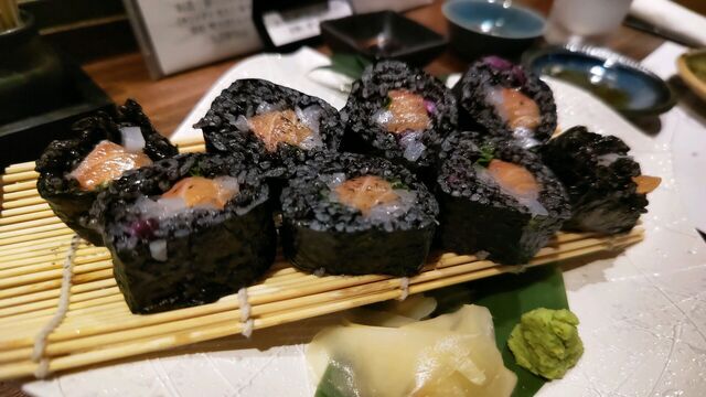 イカスミのサーモン巻き寿司1280円。これはサーモンの巻き寿司だが、シャリにイカスミが入れてあって、インスタ映えする。味はただ、イカスミを入れてもあまり変わらないが。