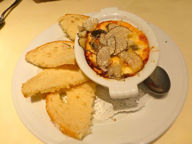生クリームとチーズと半熟卵とトリュフをぐるぐ~るかき回してパンにつけて頂きます( ̄¬ ̄) トリュフも目の前でたっぷりと削ってくれちゃいました♪