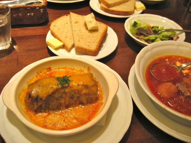 ボルシチはサワークリームが程よい酸味のアクセントですし、ロールキャベツは煮込んだ後に焼いているらしく、トマトベースのクリーミィ~なソースもかかっていて、いつも食べるロールキャベツとちょっと違ってて、それでいてめちゃめちゃ美味し~(*≧▽≦*)