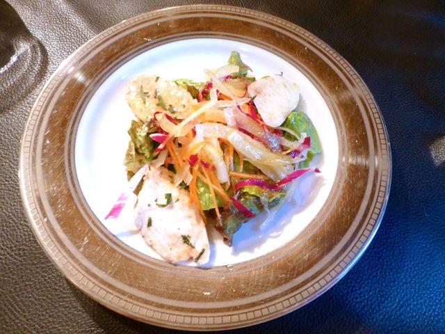 ムール貝と温野菜のドレッシングはめっちゃワインの香りがいたしますぅ〜♪ アルコールは飛んでおりますが、弱い人なら香りで酔いそうな気分になれそうです。
